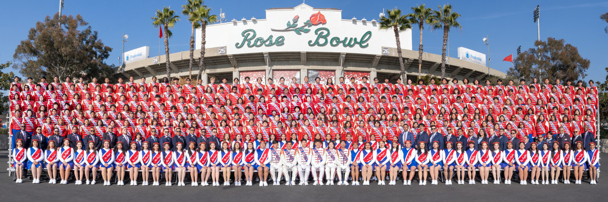 - Formal group photograph of the band in front of the Rose Bowl Stadium.