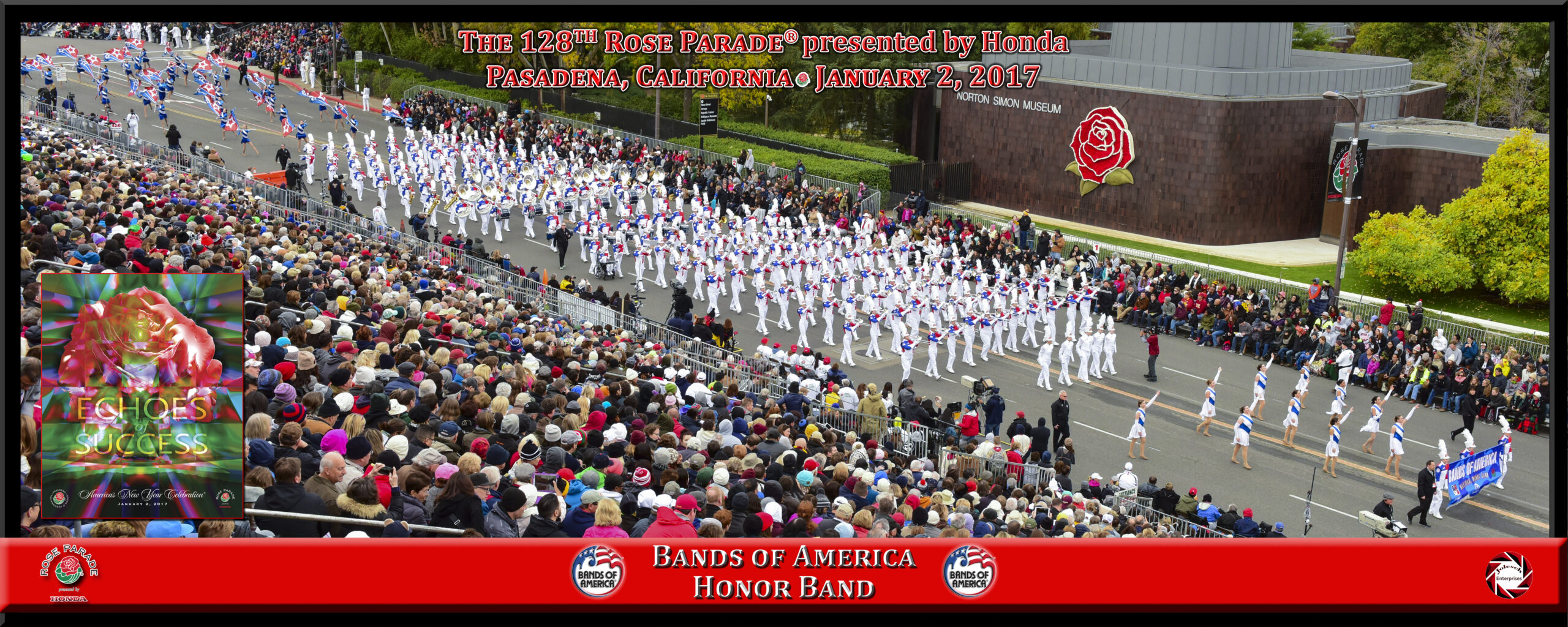 Use this page to pre-order your official Rose Parade panoramic photo package for Bands of America – Honor Band. This package includes two 8 x 24″ images: a formal group photograph of the band in front of the Rose Bowl Stadium and a parade photograph of the band marching on Colorado Blvd.